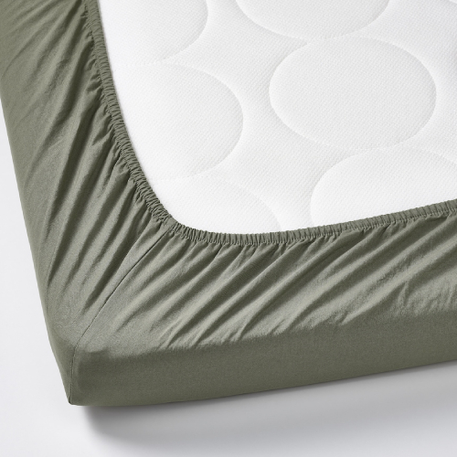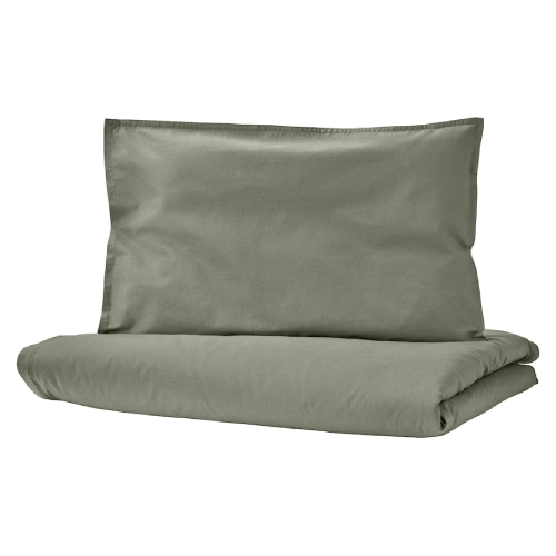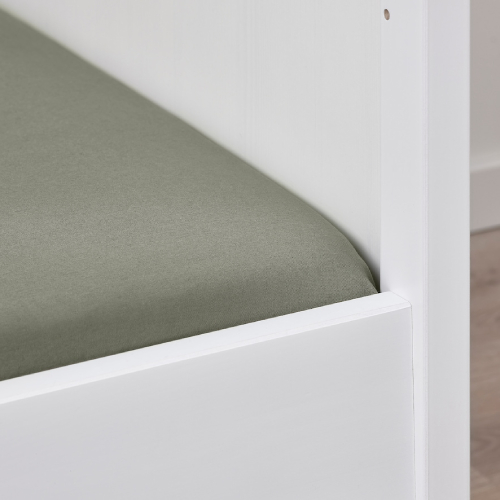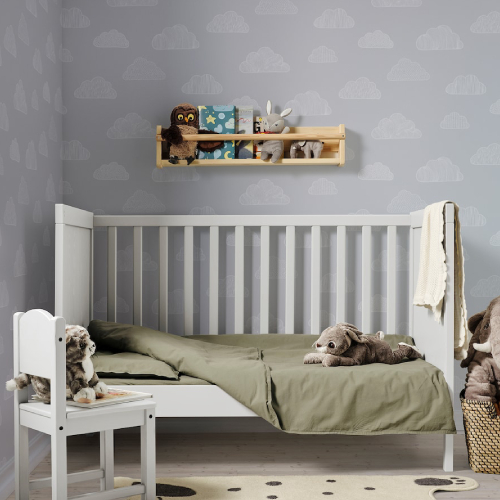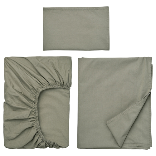 In BLOMNÄSA bedlinen set there’s everything needed to create a comfy and cosy nest for your baby – duvet cover, pillowcase and fitted sheet. All dyed by agricultural waste of the saw palmetto palm in a beautiful light-green shade.