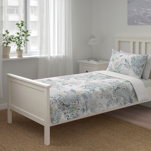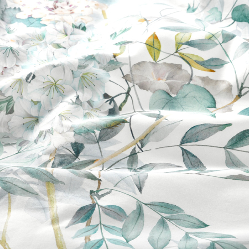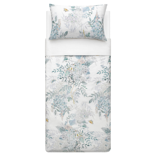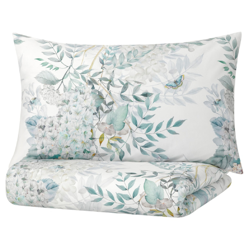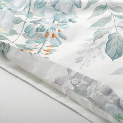 Like an oriental painting, the duvet cover and pillowcase fill your bed with flowers in mild pastel tones. The sateen-woven cotton feels soft and has a nice lustre that makes a bed wonderfully inviting.