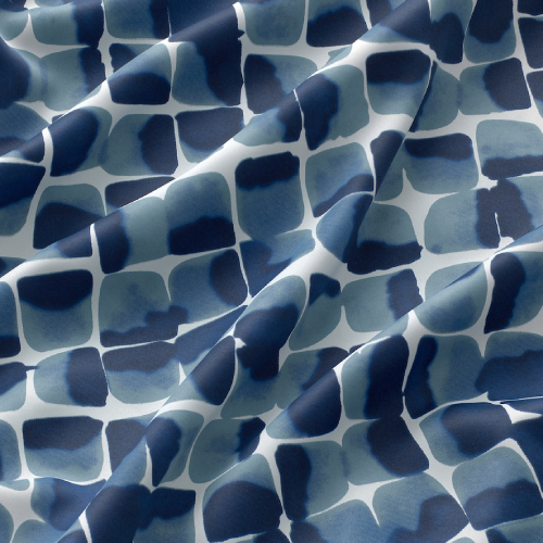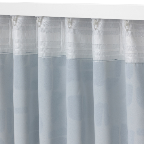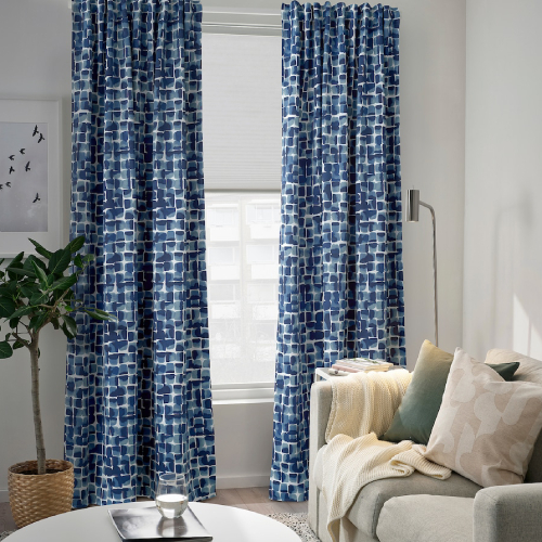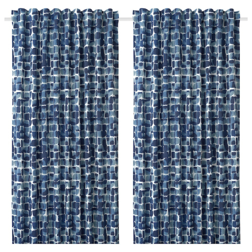 These curtains block most outside light from entering and prevent curious eyes from looking in. The thick fabric in various blue shades falls elegantly to the floor and spreads a calm feeling in the room.