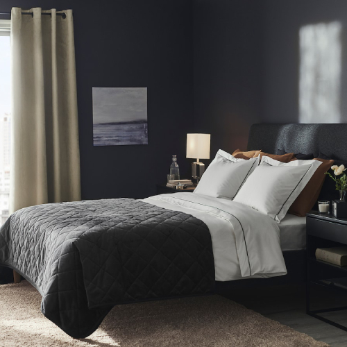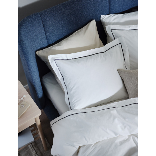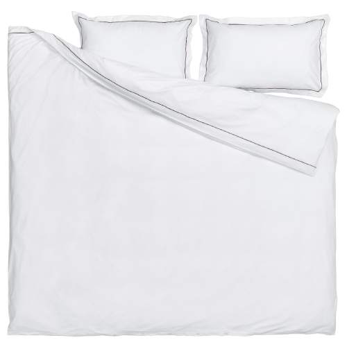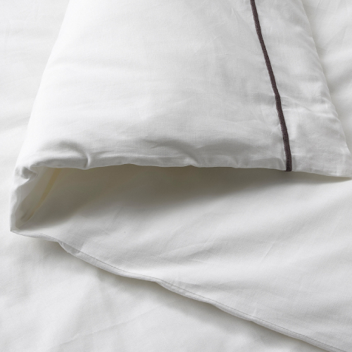 A soft, comfy duvet cover set in crisp white with a beautiful embroidered border in dark grey and a flanged pillowcase. It brings a luxurious feeling to your bedroom inspired by a classic hotel look.