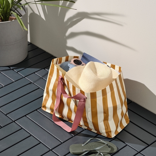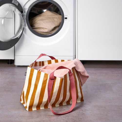 This slightly smaller bag with lovely sunny yellow stripes holds the most important things. Easy to throw over your shoulder, a breeze to clean and simple to store away when it’s empty.