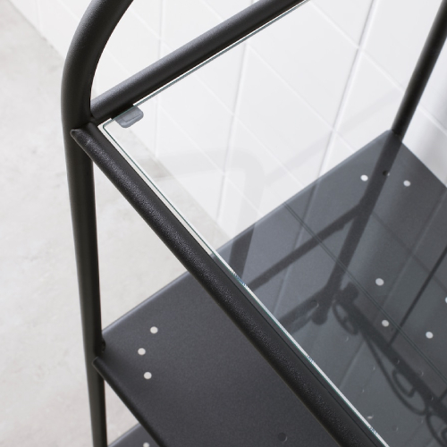 A low shelving unit in the RÖNNSKÄR series. Curvy details and shelves of glass and steel are ready to accommodate your folded towels and beauty products to create a personal and charming look.